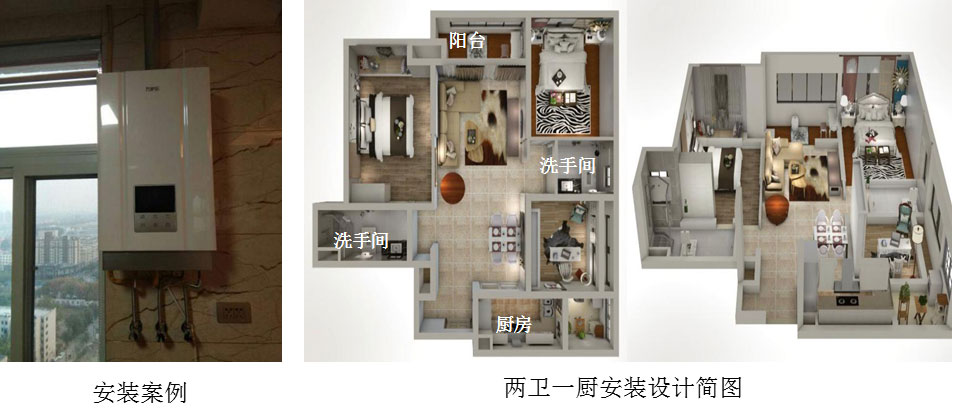 此种户型的出水点可达4-5个或以上。此种户型的厨房或阳台都可选作热水器的安装位置。或是取空间较大,或是使安装管路更简,若是厨房或阳台中有一个是两种条件都可兼具的,则为安装的首选位置。此外,安装时还应考虑水压的大小是否允许。