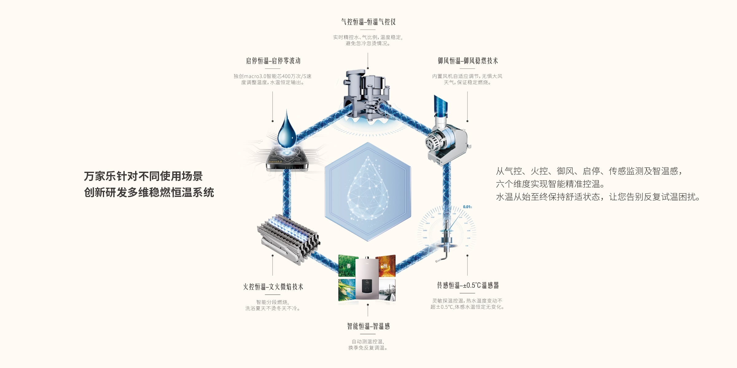 噪音最低至40dB,贴心不打扰,搭载三重热力巡航模式,恒温热水即开即来,